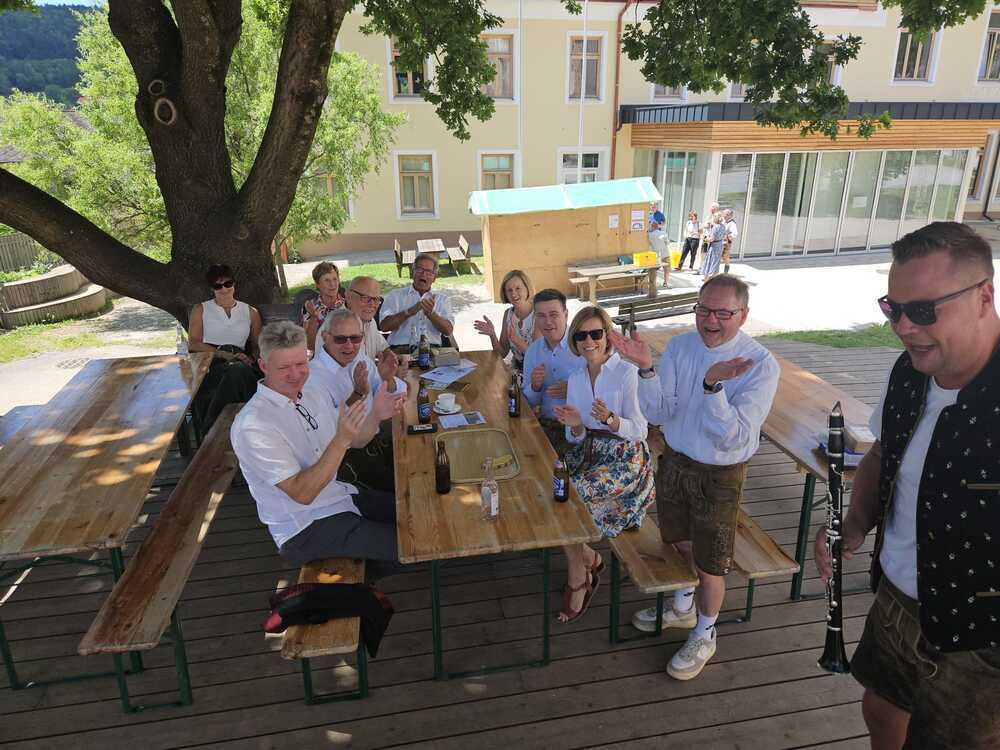 Gesellig ging es vor der Kirche weiter: Kühle Getränke halfen bei der hohen Temperatur, Frankfurter, Aufstrichbrote und Kuchen gegen den Hunger, außerdem war unter anderem für musikalische Unterhaltung gesorgt. Insgesamt war dieses Startfest eine Premiere:  Die sieben Pfarren Röthelstein, Frohnleiten mit Adriach, Übelbach, Deutschfeistritz mit Peggau, Stübing, Gratkorn und Semriach haben Messfeier und Fest miteinander und gemeinsam vorbereitet und organisiert.  Der Start in die Zukunft Kirche bei uns ist gelungen!