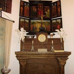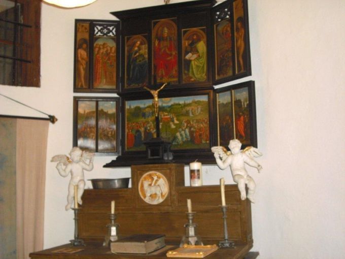 Die im 12. Jahrhundert erbaute Burg Rabenstein ist wohl eine der imposantesten Burganlagen des ganzen Murtales. Die Altburg, aus der heute ein moderner Stahl-Glas-Bau von Burgherrn DI Werner Hochegger ragt, brannte ab und wurde nicht wieder aufgebaut. Die heutige Burg wurde im 14. Jahrhundert errichtet und befand sich in landesfürstlichem Besitz. Aus dieser Zeit stammt vermutlich auch die über dem Südtor liegende Burgkapelle. Sie ist somit die älteste Privatkapelle in unserer Pfarrgemeinde. Urkundliche Erwähnungen dieser Kapelle sind aus den Jahren 1519 bis 1888 mit der Bezeichnung als „Heilig-Kreuz-Kapelle“ bzw. als Kapelle zur „Heiligen Kreuzabnahme“ vorhanden. Ein großes Gemälde in der Kapelle zeigt dieses Motiv der Kreuzabnahme. Leonhard von Harrach, Verweser in Steiermark und Hauptmann zu Pettau, stiftete am 18. Dezember 1519 eine tägliche Messe, die am Donnerstag in der St. Georgs-Pfarrkirche, an Sonn- und Feiertagen sowie an Werktagen, an denen der Stifter nicht an der Zelebration in Adriach teilnehmen konnte, in der Burg Rabenstein abzuhalten war. Er stattete diese Stiftung großzügig mit einer Hofstatt im Forstgraben als Kaplanswohnung und 28 Pfund Pfennigen Herrengült aus. Nach der Visitation am 25. Oktober 1618 durch den Seckauer Fürstbischof ging der Besitz der Kapelle von etlichen Bauern an die Herrn von Windischgräz über. Anlässlich einer Visitation vom 12. Jänner 1756 wurde die Burgkapelle zum „Sacellum publicum“, d.h. zu einer öffentlichen Kapelle erklärt, in der wenigstens drei Messen im Jahr gefeiert werden sollten. Im Oktober 1869 beantragte der kunstsinnige k.k. Burghauptmann Ludwig von Montoyer beim fürstbischöflichen Ordinariat in Graz einige bauliche Änderungen, wodurch sie ihr heutiges Aussehen erhielt. Sie ist ca. 19 m² groß, 3,75 m hoch und bietet Platz für maximal 10 Personen. Im Mittelpunkt der Burgkapelle hängt ein beeindruckender Flügelaltar. Es handelt sich dabei um eine originalgetreue Nachbildung des berühmten Genter Altars (Belgien), der 1432 am Höhepunkt der Flämischen Schule von Jan van Eyck geschaffen wurde. Auf dem Altaraufsatz ist die Anbetung des Gotteslammes zu sehen, einem Symbol für Jesus Christus in der Schlussszene der Offenbarung des Johannes, und der Einzug der Auserwählten nach dem Jüngsten Gericht in das Neue Jerusalem. Der beherrschende Mittelteil des Bildes zeigt Gottvater als thronenden Weltenherrscher sowie die heilige Maria und Johannes den Täufer. Auf den Seitenflügeln wird diese Gruppe von musizierenden Engeln sowie von Adam und Eva begleitet. Man sieht den gut erhaltenen Flügelaltar nun immer mit der Festtagsseite, also mit geöffneten Flügeln, die man früher nur zu den großen Festen Ostern, Weihnachten und Allerheiligen zeigte. Auf der Alltagsseite, den geschlossenen Flügeln, gibt es insgesamt 12 Bilder. Sie zeigen unter anderem Johannes den Täufer, Johannes den Evangelisten und Mariä Verkündigung. Der Andachtsraum besitzt einen Steinboden, drei Fenster sorgen für Tageslicht und in der Mitte der Kapelle hängt eine kunstvolle Ampel. Es gibt mehrere Heiligenbilder, schön gearbeitete Holzsessel und einen kleinen Holzaltar mit Altarkreuz. Am 9. März 1888 erhielt der neue Besitzer der Burg, Fritz Reininghaus, vom fürstbischöflichen Ordinariat die Erlaubnis, in der Burgkapelle jährlich wenigstens zehn Messen feiern zu dürfen, besonders an Familiengedächtnistagen. Nach dem Tod von Sigurd Reininghaus 1981 sollen für den Verstorbenen auf Initiative der damals im Schloss Waldstein lebenden Ex-Kaiserin Zita eine oder zwei Messen in der Kapelle gefeiert worden sein. Vor der Übernahme der Burg Rabenstein durch den Grazer Unternehmer DI Werner Hochegger im Jahr 2005 sind aus der Kapelle leider einige sakrale Gegenstände abhanden gekommen. Der jetzige Eigentümer hat jedoch dankenswerterweise dafür gesorgt, dass die Burgkapelle wieder renoviert wird, so dass man sie wieder als Messkapelle nützen könnte. Auf diese Weise ist dafür gesorgt, dass die ca. 700-jährige Geschichte dieser wunderbaren Kapelle eine Fortsetzung finden kann. |