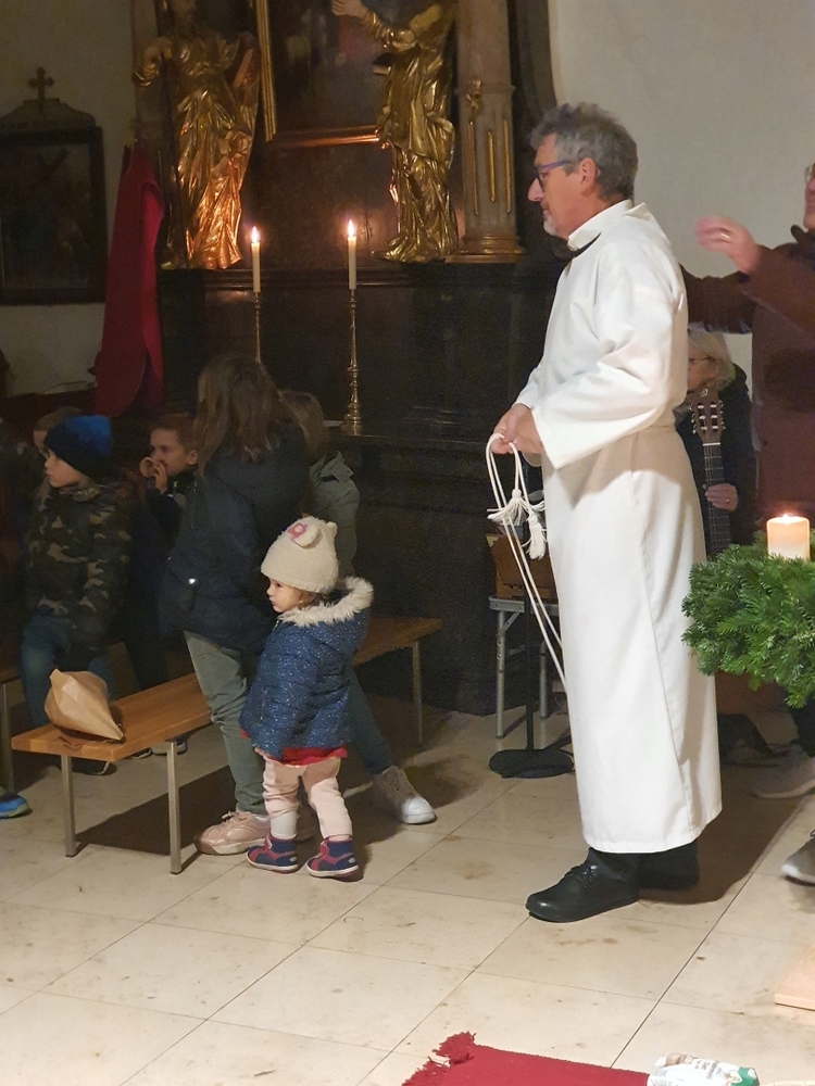 Die Christmette, dieses Mal eine Wort-Gottes-Feier mit Kommunionspendung, feierte Diakon Wolfgang Garber mit uns. In seiner Predigt lud er uns ein, es Weihnachten werden zu lassen, indem wir uns „in die Krippe unseres Nächsten“ legen, d.h. achtsam und einfühlsam mit unseren Mitmenschen umgehen, sodass „Menschwerdung“ erfahrbar wird. Stimmungsvolle Weihnachtslieder erfüllten die abendliche Kirche und die Herzen.